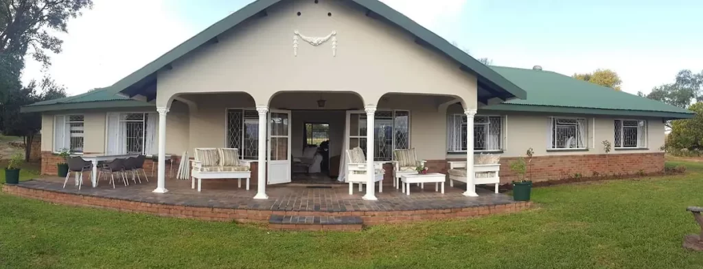 This is a beautiful farm house on our farm Tugela falls on the R74 between Bergville and Winterton. 5 km from Bergville. It is situated on the Tugela River . It is spacious with 3 double rooms and a dorm that sleeps 8 . It has 3 bathrooms. A fully equipped kitchen. Lounge and dining room as well as a patio with a braai. It also has an outside flat with 2 double bedrooms. separate toilet. shower with a coffee and tea station.